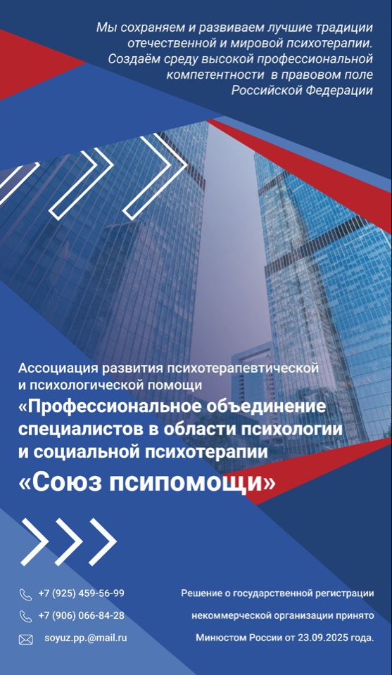 Также, мы создали и провели регистрацию в Министерстве Юстиции 23.09.2025 года новую Ассоциации «Профессиональное объединение специалистов в области психологии и социальной психотерапии «Союз псипомощи». Ассоциация построена на индивидуальном членстве профессионалов. В настоящее время запущен процесс ее преобразования в саморегулируемую организацию.